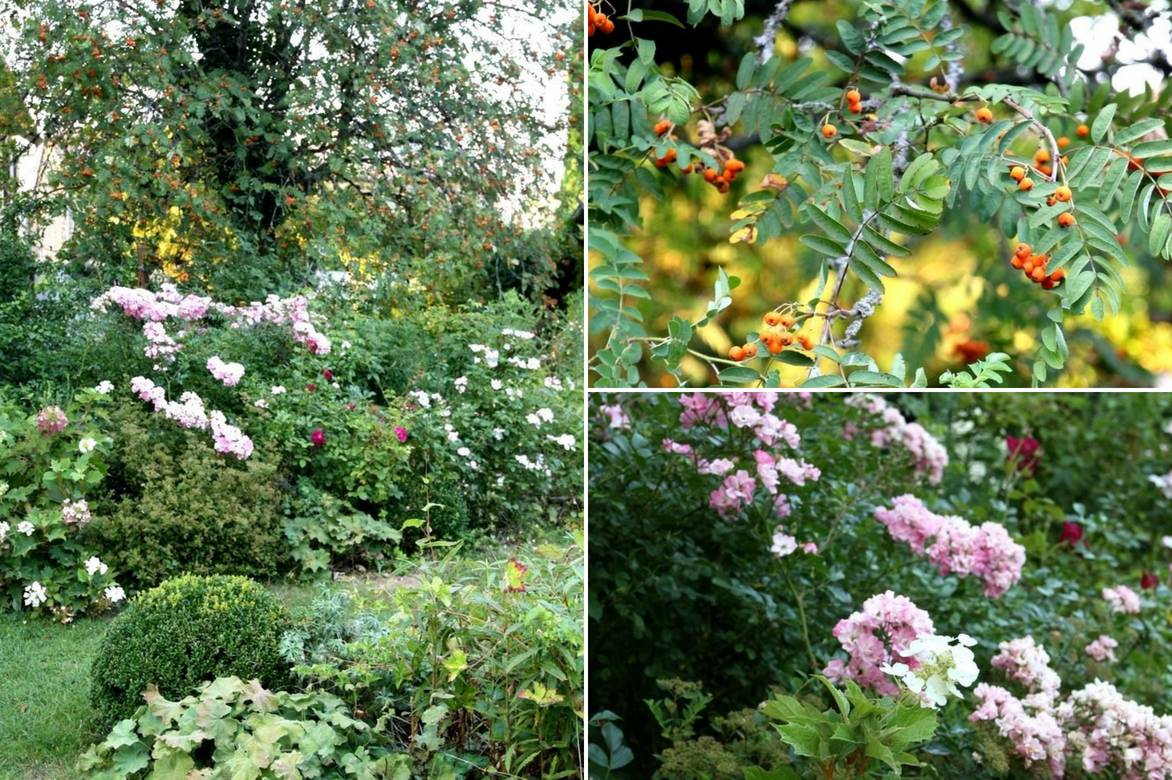 Un exemple d’association en massif estival : Sorbus aucuparia, rosiers ‘Castor’ et ‘Munstead Wood’ entre autres, Hydrangea quercifolia ‘Burgundy’ (photos Virginie Douce).