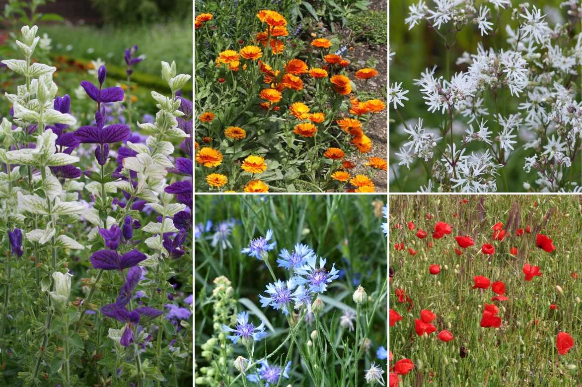 Une ambiance prairie fleurie : Salvia horminum, Calendula officinalis, Lychnis flos-cuculi ‘White Robin’, Centaurea cyanus et Papaver rhoeas