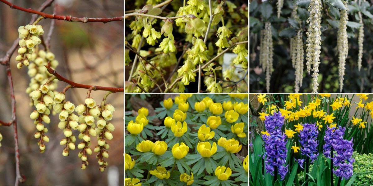 Associez le Stachyurus à d’autres arbustes, bulbeuses et vivaces qui fleurissent en fin d’hiver ou début de printemps ! Stachyurus praecox (photo Michael Wolf), Corylopsis pauciflora, Garrya elliptica ‘James Roof’ (photo PaleCloudedWhite), Eranthis hyemalis (photo Martin Olsson), Jacinthe ‘Delft Blue’ et Narcisse ‘February Gold’ (photo Andrew Lawson – Flora Press – Biosphoto)