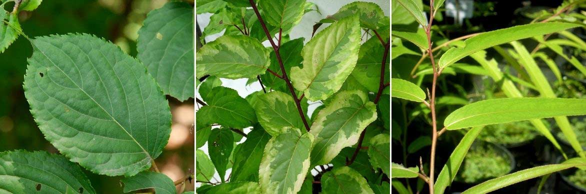Les feuilles des Stachyurus praecox (photo Σ64), Stachyurus ‘Joy Forever’ et Stachyurus salicifolius (photo Paco Garin)