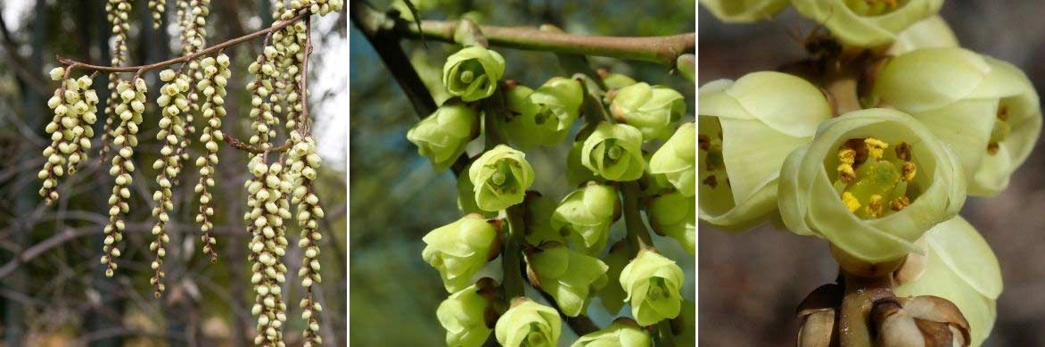 Les inflorescences et le détail des fleurs du Stachyurus praecox (photos Σ64, Salicyna et William Friedman)