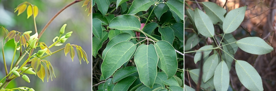 Le feuillage du Stauntonia hexaphylla : les jeunes feuilles avec leur belle couleur ambrée, le détail des feuilles adultes et le revers des feuilles (photos : igaguri_1 / KENPEI / Alpsdake)