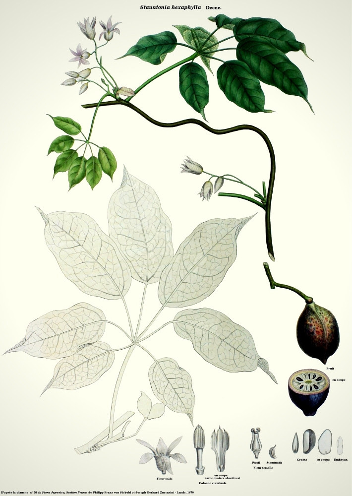 Le Stauntonia pousse rapidement et forme des tiges volubiles, qui s’enroulent toutes seules autour de leur support. Ses tiges peuvent atteindre jusqu’à 10 mètres de long ou de hauteur.