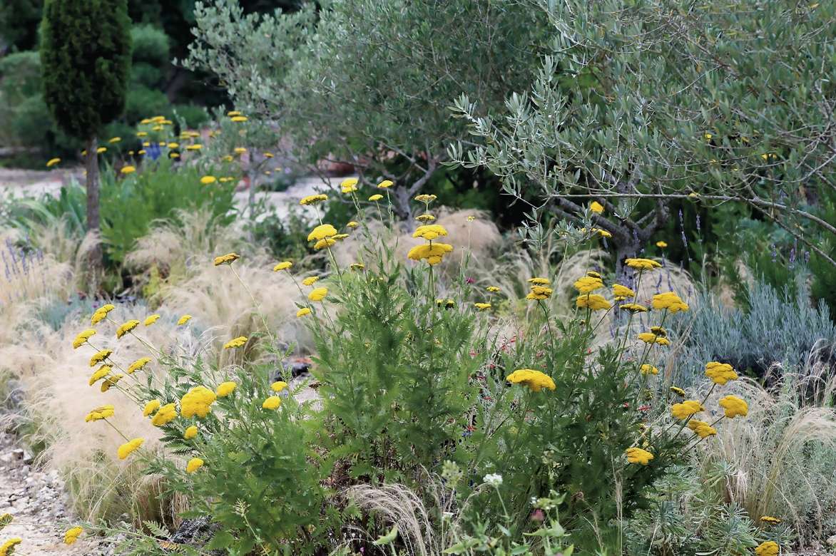 Un exemple d’association dans une ambiance méditerranéenne : Stipa tenuifolia, Achillées comme Achillea filipendulina ‘Golden Plate’, Lavande et Olea Europea (Le jardin d’Entëoulet – Gers © Renée Boy-Faget)