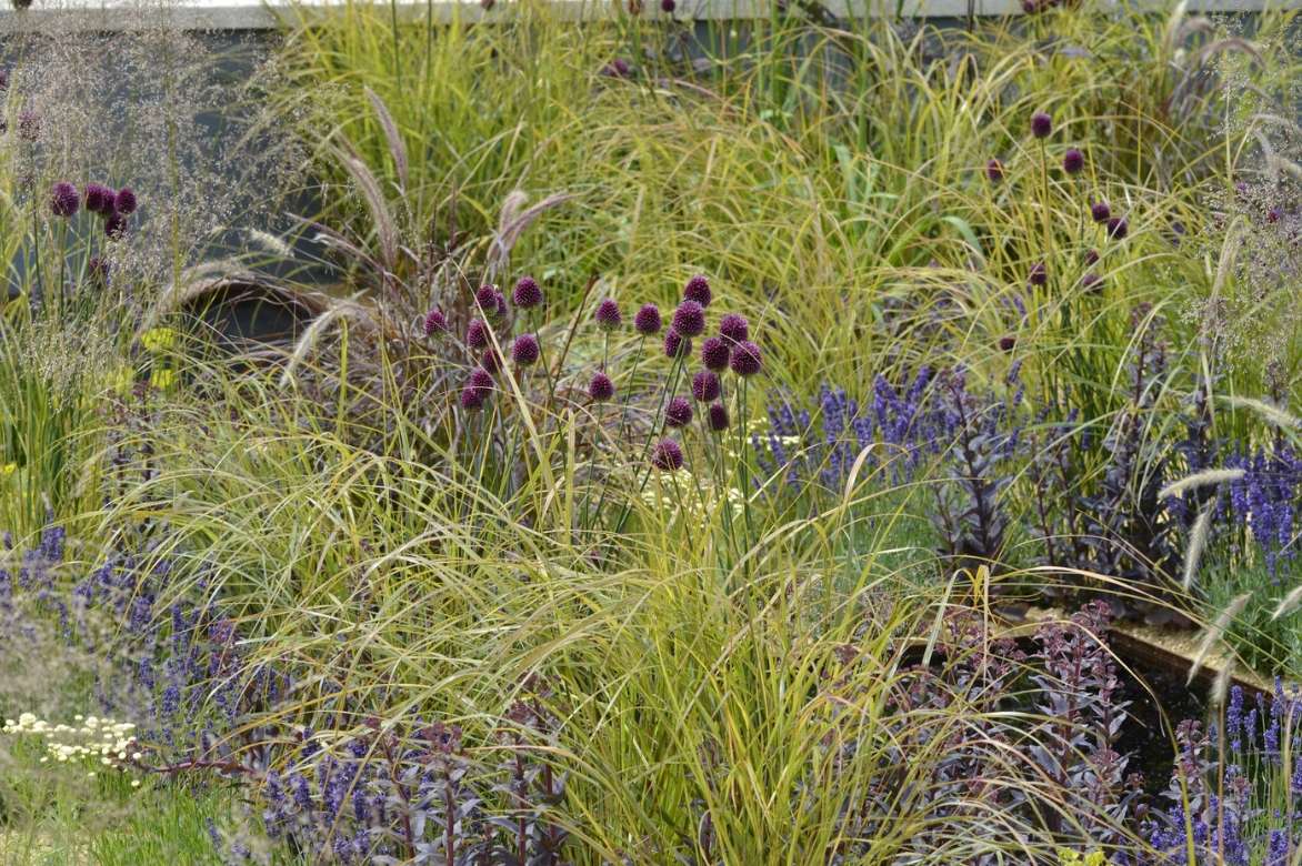 Un exemple d’association naturelle et colorée : Allium sphaerocephalon, Stipa arundinacea, Lavande, Sedum pourpre comme la superbe variété ‘Purple Emperor’ et quelques Pennisetums (©Nathalie Pasquel – MAP)