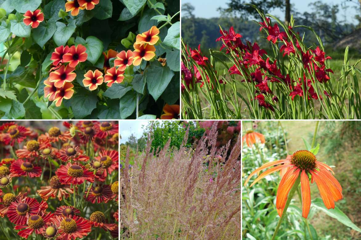Un exemple d’association dans les tons chauds : Thunbergia ‘Tangerine Slice’, Gladiolus ‘Robinetta’, Helenium ‘Ranchera’, Calamagrostis acutiflora ‘Avalanche’, Echinacea ‘Tomato Soup’.