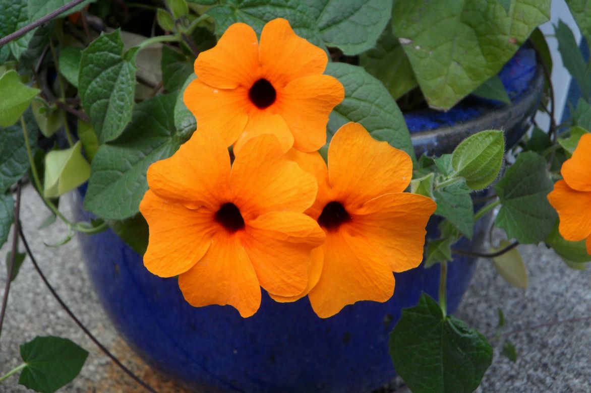 Toutes les Suzanne aux yeux noirs conviennent à la culture en grand pot ou dans une suspension (l’astuce pour ne pas avoir à tuteurer la belle grimpante !). Elles peuvent être sorties à la belle saison et remisées dès les premiers frimas comme gardées dans une véranda au chaud tout au long de l’année.