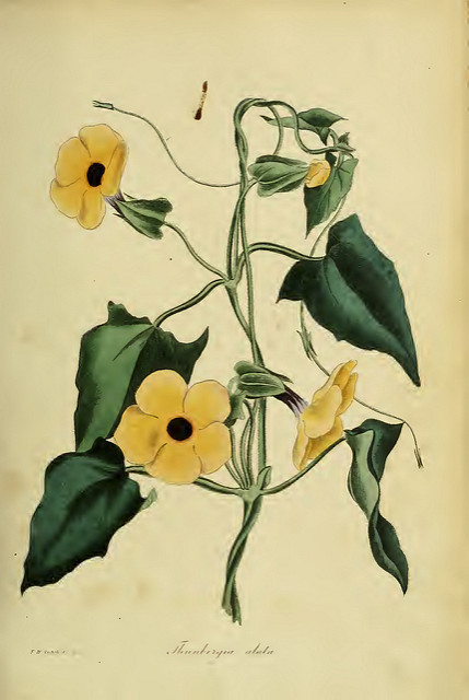 Le Thunbergia, ou plus poétiquement « Suzanne aux yeux noirs » ou également « Œil de Suzanne » ou « Sourire de zanzibar » est une plante grimpante et volubile de la famille des Acanthacées, originaire des régions tropicales d’Afrique de l’Est et du Sud, de Madagascar et d’Inde. A l’état naturel, elle pousse dans les forêts, les parois rocheuses, enroulée autour des arbres ou des arbustes.