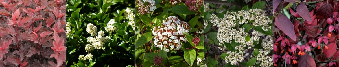 Un exemple d’association en haie : Physocarpus ‘Lady in Red’, Ligustrum japonicum ‘Rotundifolium’, Viburnum tinus ‘Spirit’, Cotoneaster lacteus, Euonymus planipes.