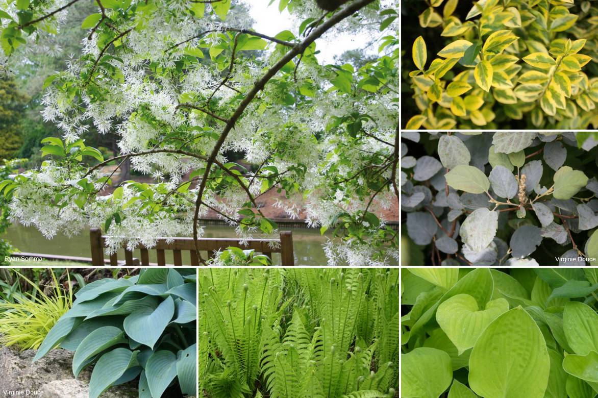 Une idée d’association à mi-ombre : Ligustrum ovalifolium ‘Aureum’, Fothergilla intermedia ‘Blue Shadow’, Hosta ‘August Moon’, Matteuccia struthiopteris, Hakonechloa macra ‘All Gold’, Hosta ‘Halcyon’ sous le couvert d’un Chionanthus virginicus.