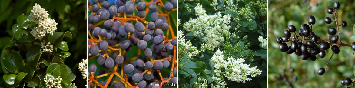 Floraison et fructification de troènes : Ligustrum japonicum ‘Rotundifolium’, Ligustrum ibota ‘Musli’, Ligustrum ovalifolium, Ligustrum vulgare ‘Lodense’.