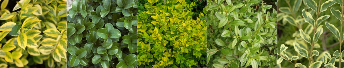 Feuillages de troènes : Ligustrum ovalifolium ‘Aureum’, Ligustrum japonicum, Ligustrum x ‘Vicaryi’, Ligustrum vulgare ‘Atrovirens’, Ligustrum ibota ‘Musli’.