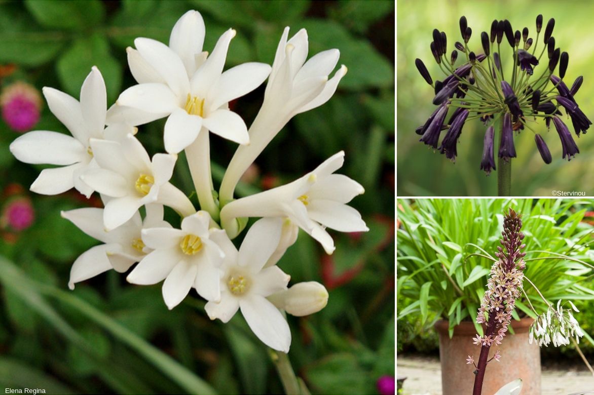 Pour créer un massif tout en hauteur, associez vos Tubéreuses avec d’autres plantes à hampes florales de grande taille, comme des Agapanthes, des Glaïeuls ou le très beau Eucomis ‘Burgundy Wine’.