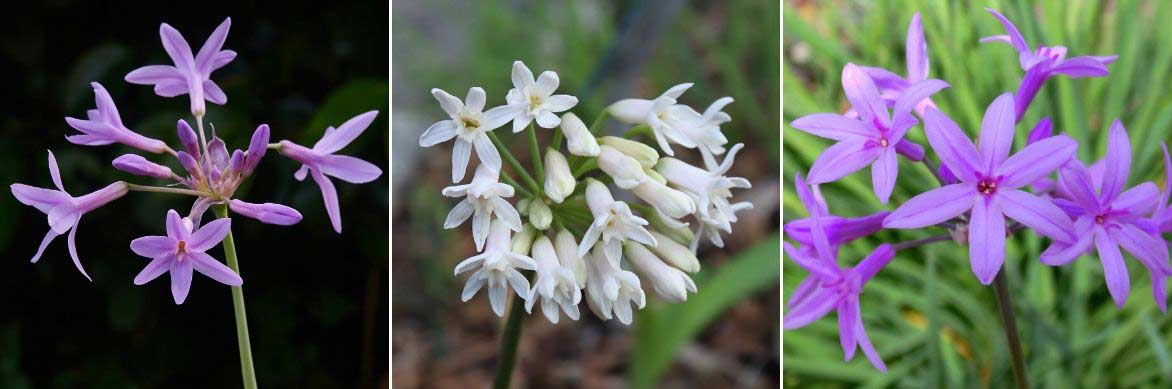 La floraison du Tulbaghia ! Tulbaghia violacea ‘Variegata’ (photo Wouter Hagens), Tulbaghia simmleri ‘Alba’ (photo Vahe Martirosyan), et Tulbaghia violacea (photo Krzysztof Ziarnek)