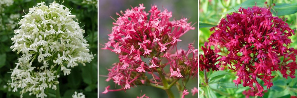 Plusieurs couleurs de Valériane des jardins : Centranthus ruber ‘Albus’, Centranthus ruber, Centranthus ruber ‘Coccineus’ (photo PAP)