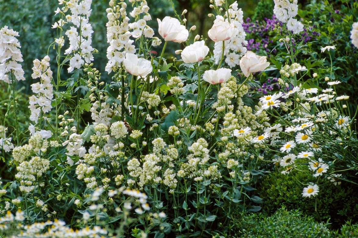 Un autre exemple d’assocation plus ton sur ton : Delphinium blanc comme ‘Galahad’, Papaver orientale comme ‘Perry’s White’, Centranthus ruber ‘Albus’ et une marguerite comme Leucanthemum superbum ‘Becky’