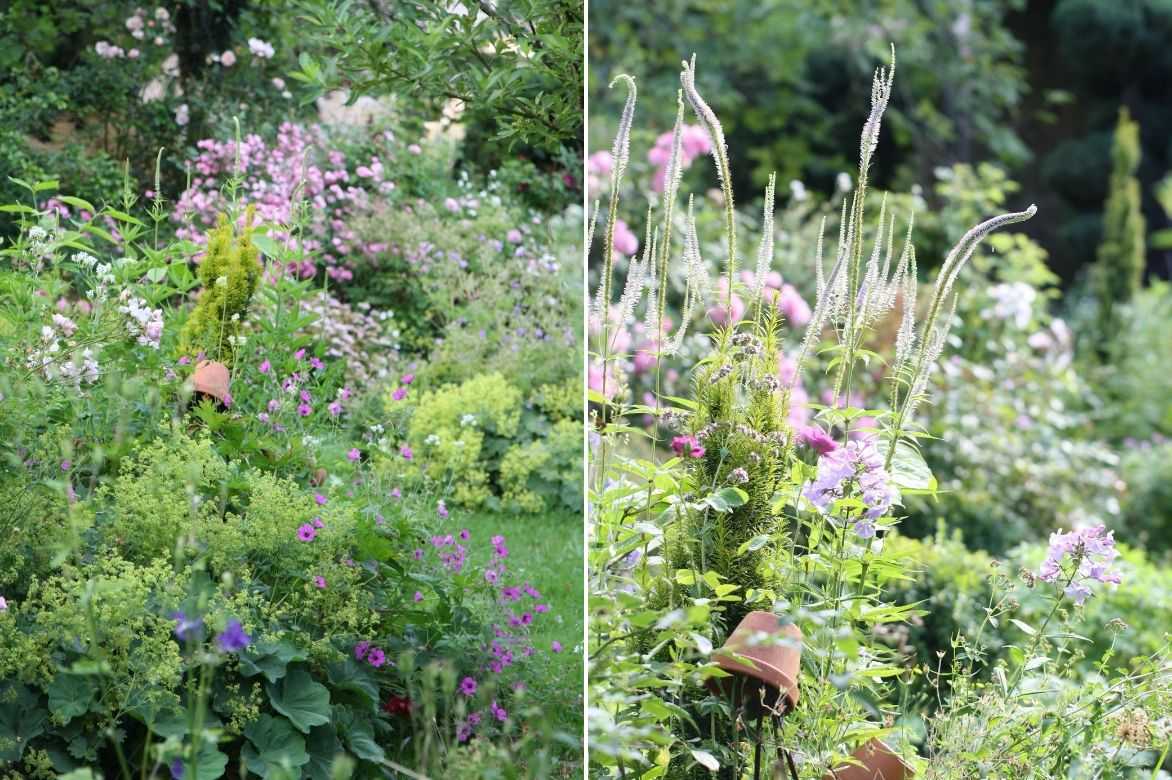 Un exemple d’association naturelle : Veronicastrum virginicum var album, Geranium ‘Patricia’, Alchemilla mollis, rosier, Centranthus ruber ‘Albus’