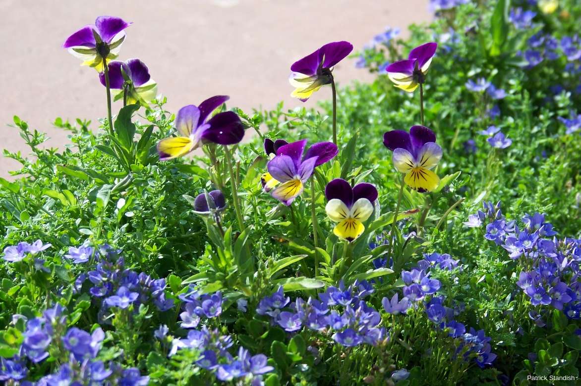 Les Véroniques (Veronica liwanensis) couvre-sols forment aussi un joli tableau coloré avec de petites Violas