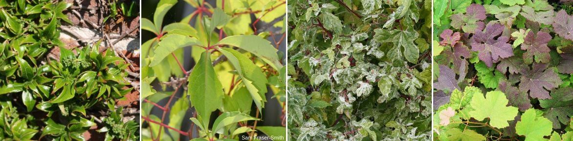 Quelques feuillages de vignes vierges : Parthenocissus tricuspidata ‘Lowii’, Parthenocissus quinquefolia, Ampelopsis glandulosa ‘Elegans’ et Vitis vinifera ‘Purpurea’