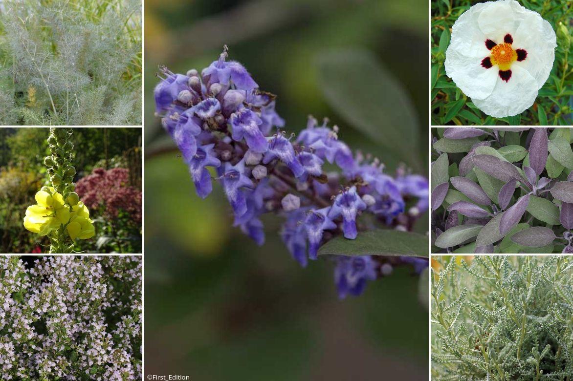Une belle idée d’association : Vitex agnus-castus ‘Flip Side’ en pièce maîtresse, accompagné de Cistus ‘Alan Fradd’, Salvia officinalis ‘Purpurascens’, Santolina chamaecyparissus, Foeniculum ‘Bronze’, Verbascum thapsus et Calamintha nepeta. Ajoutez aussi quelques touffes de Stipa gigantea et ce sera parfait !