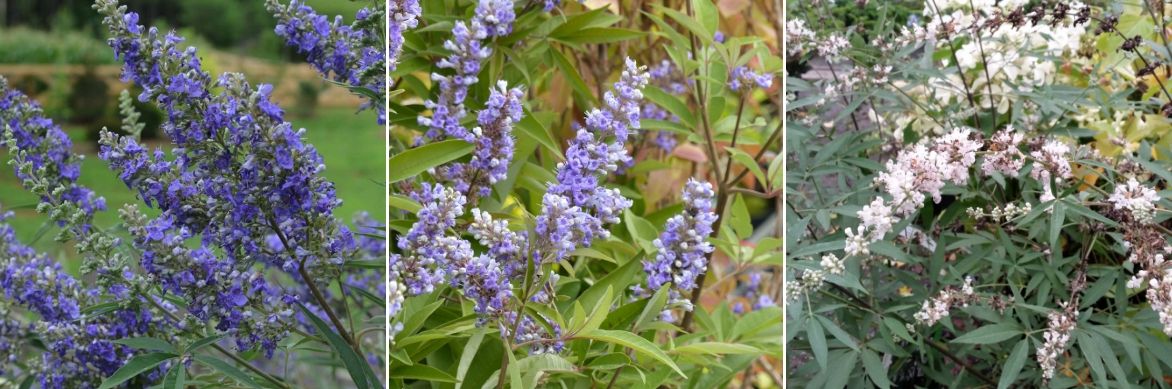 Du Vitex agnus-castus ‘Albus’ ou ‘Alba’ à fleurs blanches, au Vitex agnus-castus ‘Delta Blues’ d’un bleu violacé vif, en passant par le Vitex agnus-castus ‘Blue Puffball’, une nouvelle variété de Gattilier au développement très réduit, sans oublier le Vitex negundo et le Vitex agnus castus ‘Latifolia’ aux feuillages très incisés, tous apportent une touche de simplicité et de fraîcheur dans une haie fleurie, en isolé, dans un massif d’arbustes et même sur une terrasse.