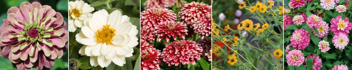 Quelques fleurs de zinnias : Zinnia ‘Queen Red Lime’, Zinnia ‘Profusion Double White’, Zinnia elegans ‘Mazurkia’, Zinnia peruviana, Zinnia ‘Double Zahara Raspberry’