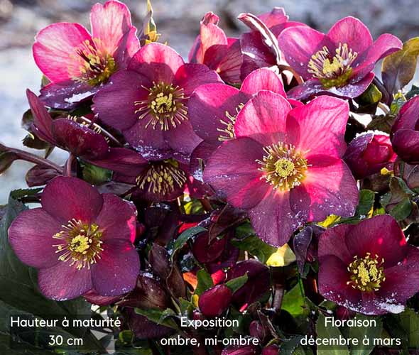 L'Hellébore Ice n'Roses Red est une nouvelle obtention qui nous gratifie d'une très longue floraison entre décembre et avril, sous forme de grandes fleurs de 10 cm de diamètre, intensément colorées. Né d'une hybridation puis d'une sélection rigoureuse, cet Hellébore donne une plante à la fois très résistante au froid et aux sols calcaires, plutôt secs en été. Enfin un hellébore pour tous !