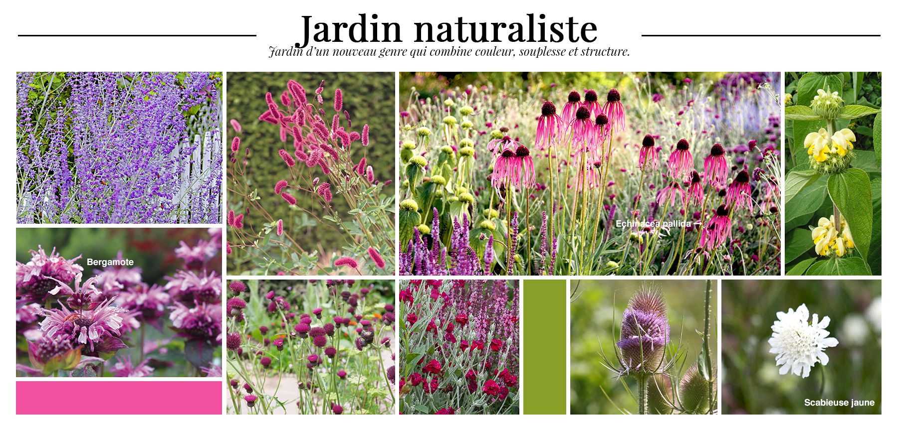 Ce jardin d'un nouveau genre combine couleur, souplesse et structure. Si le maître mot est naturel, les vivacesqui le composent répondent à 3 critères importants: robustesse, rusticité et compacité. Elles supportent de multiples conditions de culture et ne sont pas envahissantes. Les espèces légères: graminées, verveines, sauges... dominent l'espace tandis que les formes structurantes sont plantées çà et là pour animer le jardin.