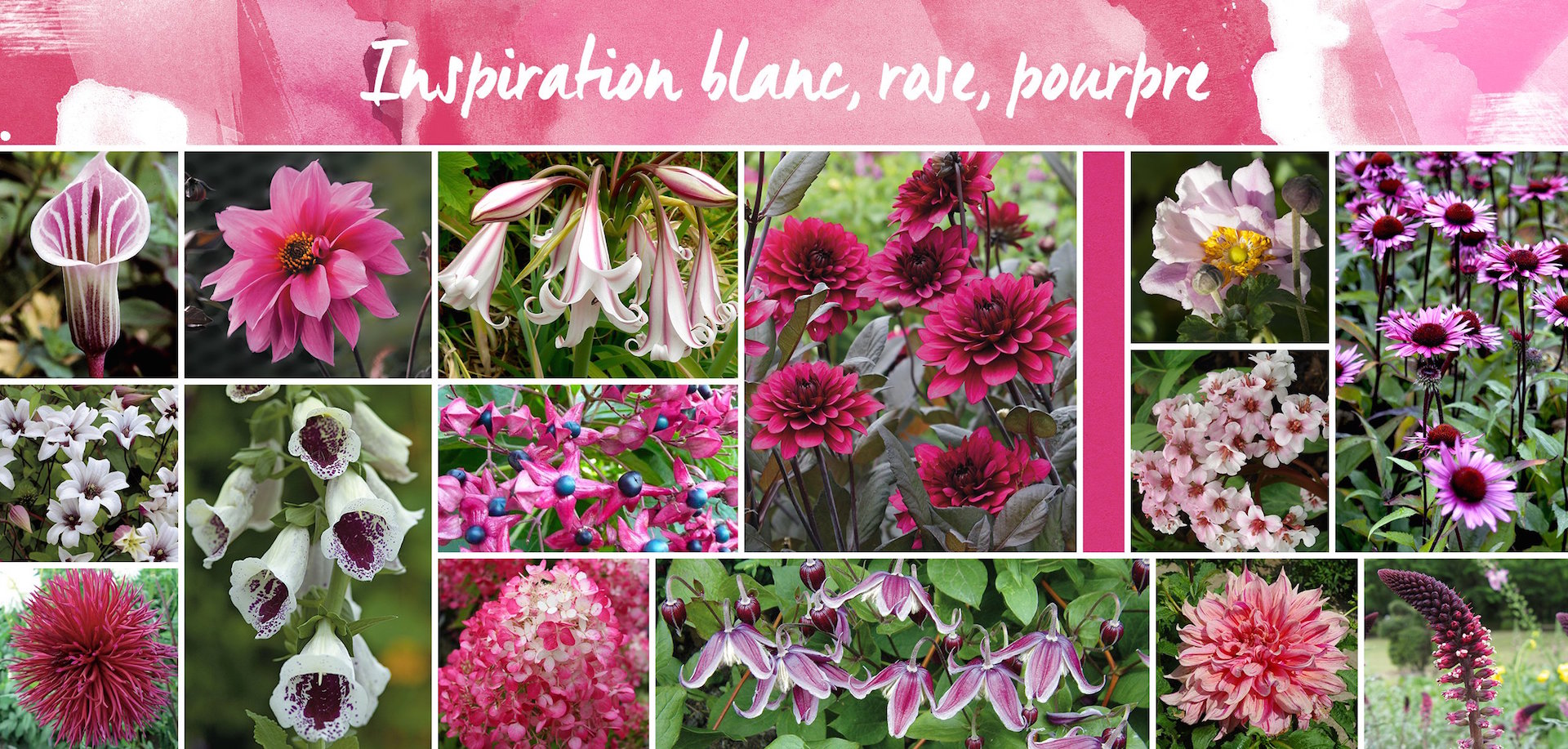 Dahlias, clématites, anémones, hortensias ... Retrouvez notre sélection de plantes pour un jardin Blanc, Rose et Pourpre. Composez avec ces végétaux de choix une scène de jardin remarquable et fleurie.