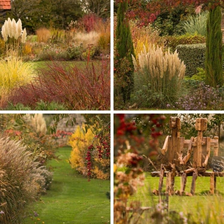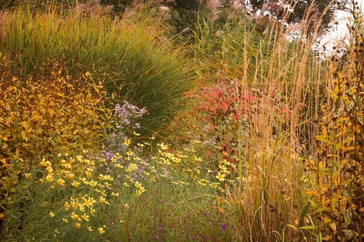 Ainsi, de très nombreuses graminées ornementales dansent sous le vent. De grands Miscanthus aux formes généreuses, des Cheveux d'Ange à la blondeur éblouissante, des Panicum aux teintes incroyables (comme cet exemplaire de Panicum virgatum 'Heilinger Hain' aux reflets pourpres et violacés intenses), ou encore des Molinies à la silhouette élégante. Entre ces belles dames d'entretien facile et très limité, se faufilent quantité de vivaces de tailles et couleurs différentes : des Eupatoires (que Michèle aime beaucoup pour leur très longue floraison et leur beauté, même une fois les inflorescences séchées), des Persicaires (dont il existe une grande diversité de cultivars), des Helenium, des Hélianthèmes, des Verveines de Buenos Aires (pour leur graphisme et leur transparence) ou encore les incontournables Asters, parmi les rois de l'automne. Le jardin est assez vaste pour accueillir également de nombreux arbres et arbustes, sans pour autant briser l'idée du jardin de prairie. Ainsi, on peut contempler plusieurs Liquidambars aux teintes automnales à tomber, des Cornouillers à bois colorés, des Eleagnus (avez-vous déjà senti le parfum puissant et divin que leurs minuscules fleurs diffusent en fin de saison chez certaines espèces ?), des Pommiers d'ornement dont les petites pommes, pas plus grosses que des cerises, peuvent persister tout l'hiver, et font le régal des oiseaux, ainsi que plusieurs conifères qui garantissent une structure permanente (Cèdre, Cyprès, Génévriers…).