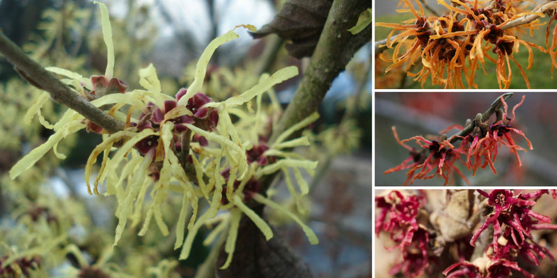 Différentes variétés d'hamamelis : H. pallida, Jelena, Feuezauber et Amethyst