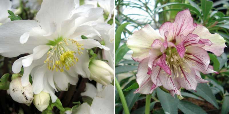 L' Helleborus niger Double Fashion (à gauche) est la première à ouvrir le bal, ses fleurs blanches, immaculées s'épanouissent courant décembre, c'est la seule Hellébore de noël à fleurs doubles / Helleborus orientalis Double Picotee (à gauche), est tout aussi originale. Cette variété s'épanouit en fin d'hiver.