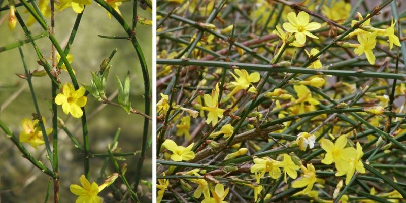 Les fleurs jaune d'or du Jasminum nudiflorum s'épanouissent au cœur de l'hiver, malgré les apparences ce jasmin d'hiver est parfaitement rustique, ses fleurs s'épanouissent même lorsqu'il gèle.