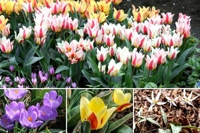 Associez la belle palette de tons rouges, rose, jaune et blanc rosé de 'Mary Ann' au violet profond des Crocus Mammouth 'Remembrance' et au rouge bordé de jaune vif de la Tulipe greigii 'Mélodie d'amour', sur fond d'Erythronium dens canis 'Snowflake'. Ces dernières produisent en mars-avril de délicates fleurs recourbés blanches sur un tapis de feuilles marbrées de pourpre et de brun.