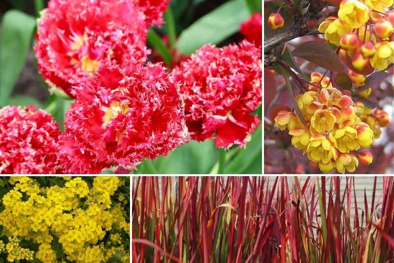 Pour créer une scène chaleureuse, plantez entre octobre et décembre notre belle tulipe en groupe au pied d'un Berberis ottawensis 'Superba' qui émaillera le printemps de petites fleurs jaune d'or sur feuillage pourpre-violacé. En tapis, une corbeille d'or vivace telle que l'Alyssum saxatile 'Goldkugel' formera au printemps un nuage doré composé d'une multitude de petites fleurs jaune très vif. Et pour alléger et compléter le tout, misez sur la graminée Imperata cylindrica 'Red Baron' : son feuillage caduc, vert olive, se teinte de rouge sang puis de rouge bordeaux dès les premières chaleurs estivales.