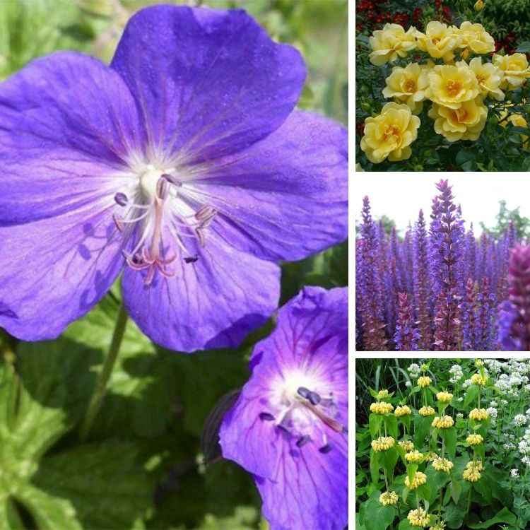 Le Géranium vivace Lea en compagnie du rosier Decorosier Suneva, de la Sauge nemorosa Ostfriesland et du Phlomis russeliana : une association dynamique pour border une allée.