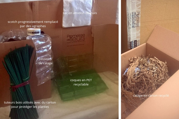 Dans un premier temps, nous avons remplacé les chips polystyrène par des "chips verts", biofragmentables et compostables. Après quelques années, cette matière biofragmentable est apparue nocive également pour l’environnement. Nous avons donc testé les "chips" bio, en amidon de pomme de terre. C’était très convaincant à l’expédition… Moins à l’arrivée : l’amidon fond en milieu humide et les plantes arrivaient chez nos clients vautrées dans une bouillie molle et collante. Nous avons également testé la paille et les résultats ne furent pas très convaincants… même si cela donnait un air terriblement champêtres à nos colis !