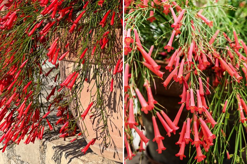 Originaire des zones tropicales d’Amérique centrale, cette plante vivace peu rustique (rusticité : -6 °C) se distingue par ses longues tiges souples et arquées, qui rappellent un peu celles des prêles. Ce feuillage fin et élégant forme un joli port retombant, parfait pour les pots, les grandes jardinières ou même les rocailles ensoleillées. Mais ce sont surtout ses fleurs qui captivent. D’un rouge vif tirant sur l'orangé, elles se présentent sous forme de petits tubes qui s’épanouissent par centaines, donnant l’impression d’une cascade de corail. La floraison, généreuse et continue, commence au printemps et se prolonge souvent jusqu’à l’automne.