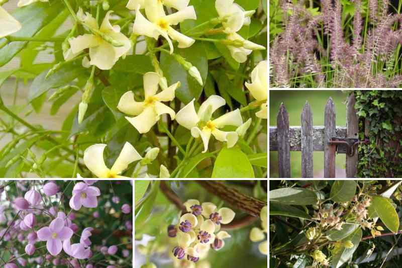 Comptez sur une base de grimpantes pour vous cacher des regards et quelques graminées souples, parfaites ici : le Pennisetum orientale 'Karley Rose', un faux jasmin jaune très odorant (Trachelospermum asiaticum), des Thalictrum delavayi 'Splendide', rose lilas et très hauts, et deux grimpantes volubiles à souhait, l'Akebia quinata choisie dans une superbe variante bicolore 'Cream Form', et un Holboellia latifolia, lui aussi persistant. Pour animer le pied des plantes grimpantes plus tôt en saison, installez en automne quelques bulbes de muscaris roses ou bleu pâle comme 'Baby's Breath', des mini-jonquilles et des anémones de Grèce 'Charmer'.