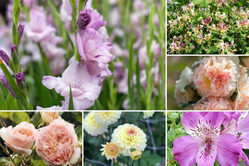 Nous avons choisi ici de composer avec des tons sorbet, vieux rose et jaune vanille pour évoquer la tendance licorne. Un chèvrefeuille mêle habilement le rose et le jaune, des roses trémières à fleurs très doubles 'Chater's Double' et un rosier grimpant 'Papi Delbard' jouent la partition abricotée, des glaïeuls adorables, 'Blue Tropic' et des alstroemerias naines, 'Pitchoune Lucas' dévoilent un mauve désaturé. Au soleil on s'entiche encore de quelques Dahlias balle 'Isa's Favorite', devancés au printemps par des tulipes tardives 'Charming Lady'. Rajoutez aussi dans ce méli-mélo floral une base de feuillages pour attendre l'été avec une sauge officinale et un abélia nain : le charme opère !