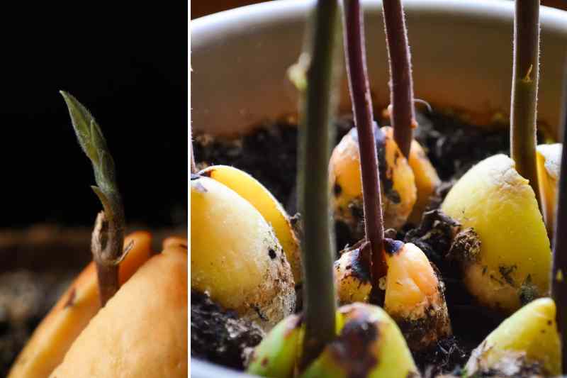 - Au bout de 3 à 6 semaines, le noyau finit par se fendre en deux pour laisser pousser les futures racines et la tige.