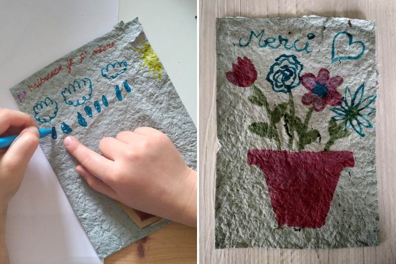 - Une fois votre papier sec, il ne vous reste plus qu'à le découper et le décorer afin d'en faire une magnifique carte à offrir. Et n'oubliez pas de donner les instructions de plantation !
