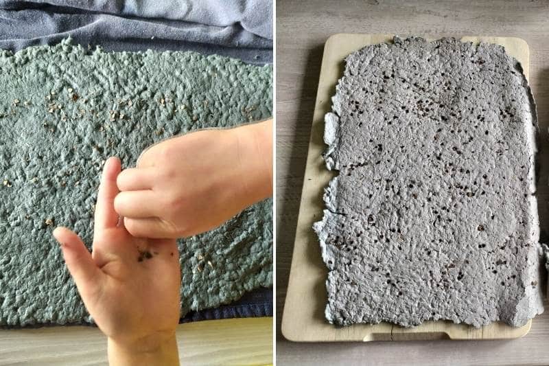 - Saupoudrer les graines sur le papier encore humide, puis tassez afin que les graines adhèrent parfaitement à la pâte à papier.