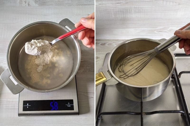 - Dans une casserole, mélangez à l'aide d'un fouet 25 gr de farine avec 50 ml d'eau.