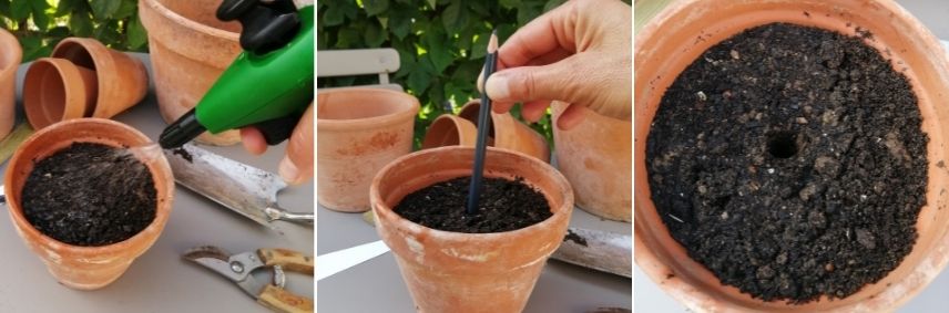 Humidifiez votre terreau, puis faites un trou de 4 à 5 cm de profondeur à l'aide d'un crayon