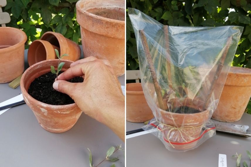 - La première consiste à réaliser une bouture dite "à l'étouffé" au mois de juillet, voir début aout. En effet, cette période de l'année, très lumineuse et chaude, favorise le développement racinaire et la réussite des boutures. Cette méthode est facile et les résultats sont rapidement visible.
