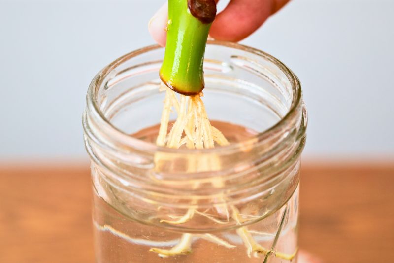 - Plongez la base dans l’eau, suffisamment pour immerger au moins un nœud, là où les racines émergeront naturellement.