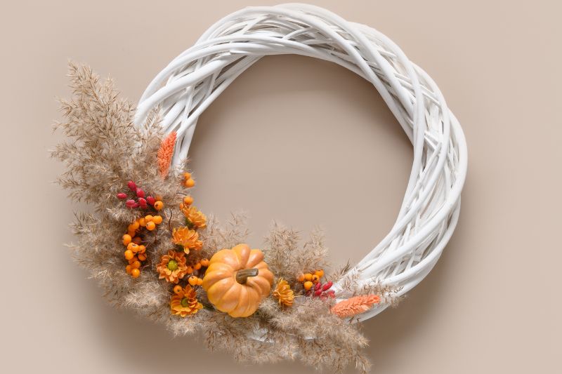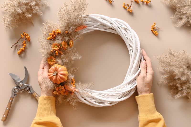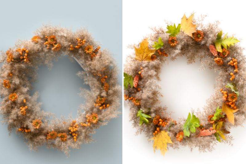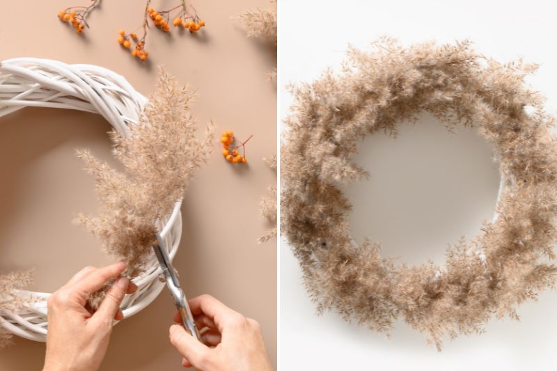 3- Ensuite, fixez les éléments de base, comme les plumeaux de graminées ou des feuilles mortes. Vous pouvez faire tout le tour de la couronne ou seulement un quart pour une touche plus actuelle.