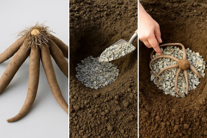 • Si le sol est lourd ou argileux, installez une épaisse couche de sable grossier ou de graviers au fond du trou de plantation. Vous pouvez même former une butte surélevée pour éviter que l’eau ne stagne au niveau des bulbes.