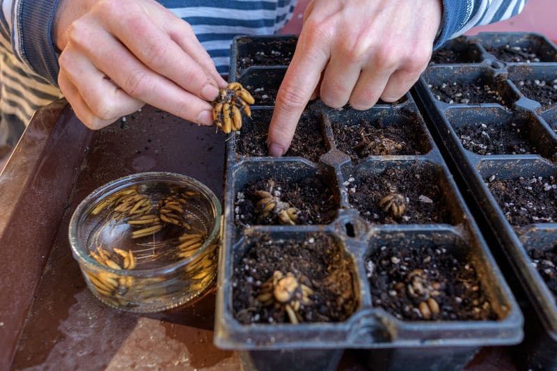 une femme plante des bulbes de renoncule en godets